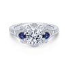 14k White Gold 3 Stone Diamond and Round Blue Sapphire Gemstone Engagement Ring. SETTING ONLY; center stone not included