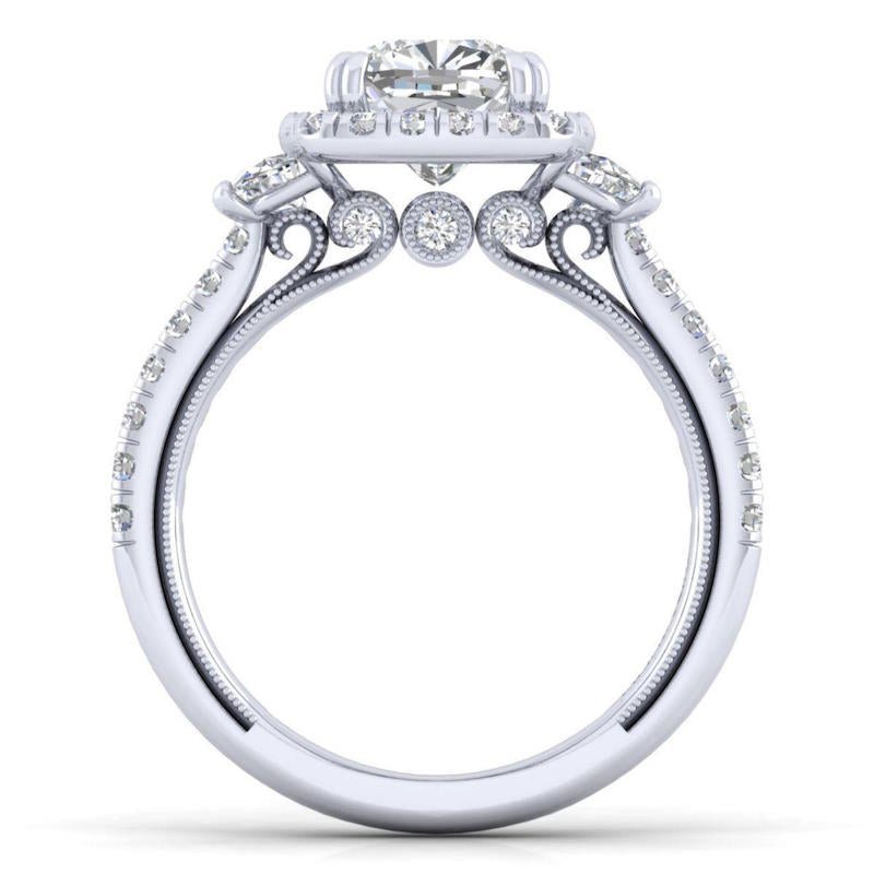 14k White Gold 3 Stone Halo Engagement Ring. SETTING ONLY; center stone not included