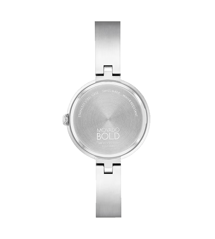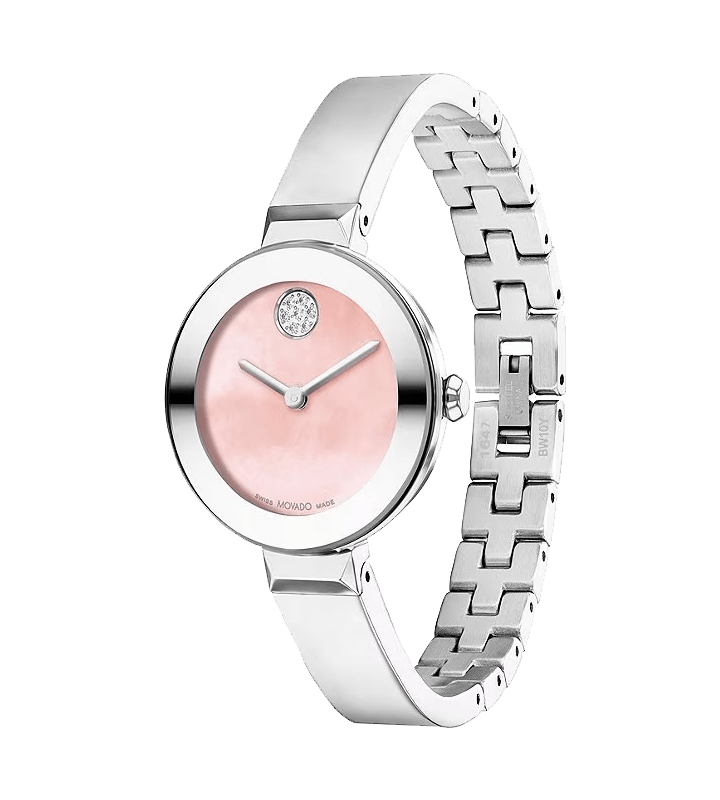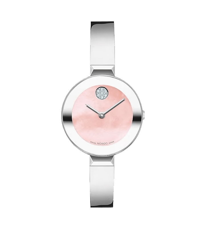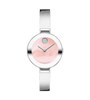 Movado BOLD, 28mm stainless steel case & bangle with a pink toned mother-of-pearl dial.