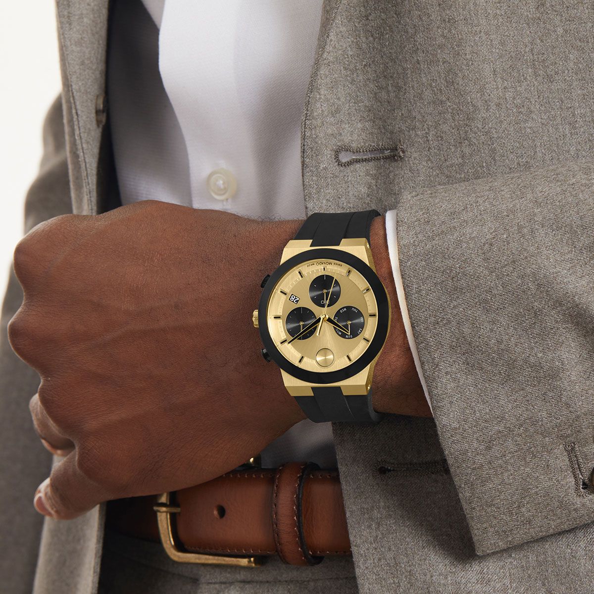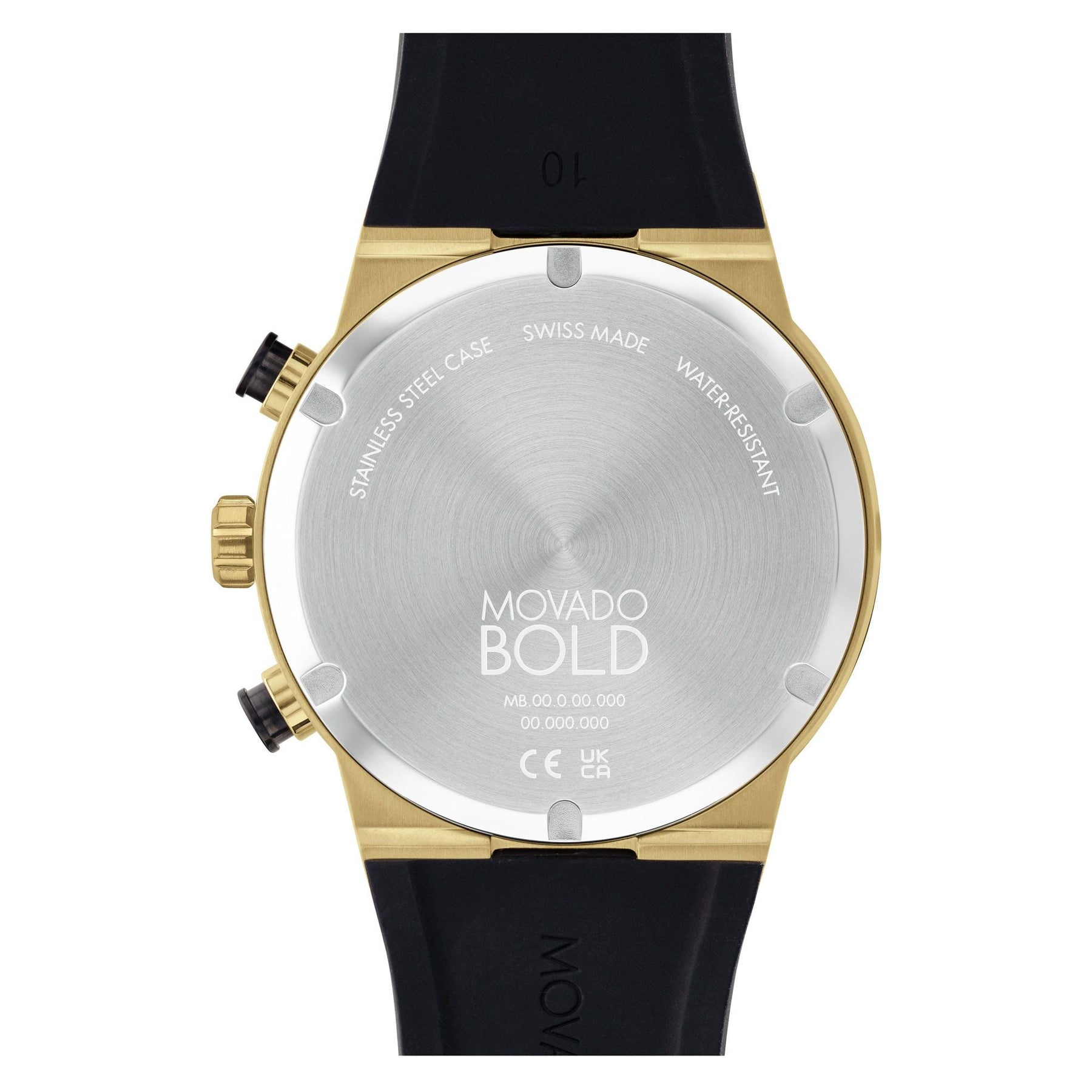 Sporty style with contemporary-cool edge. This BOLD Fusion chronograph watch from Movado features a super sleek black silicone strap for an undeniably modern feel. This minimalist design features a 44mm case crafted from gleaming pale yellow gold ion-plated stainless steel with a black ceramic bezel. Its ion-plated golden dial is accented in glossy black and boasts their iconic dot motif at 12:00, a date window, three subdials, and a minute track.