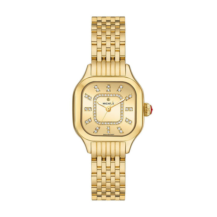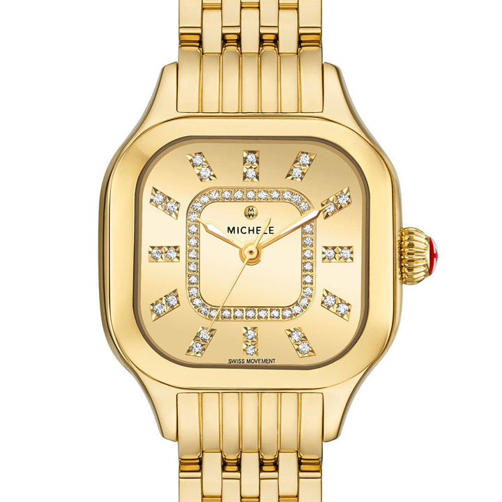 High Shine Meggie from Michele Watch company featuring a bright shiny gold dial set with diamond markers. Crafted in gold plated stainless steel with a butterfly clasp. Emblazoned with the red MW crown for easy adjustment.