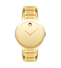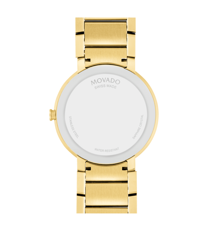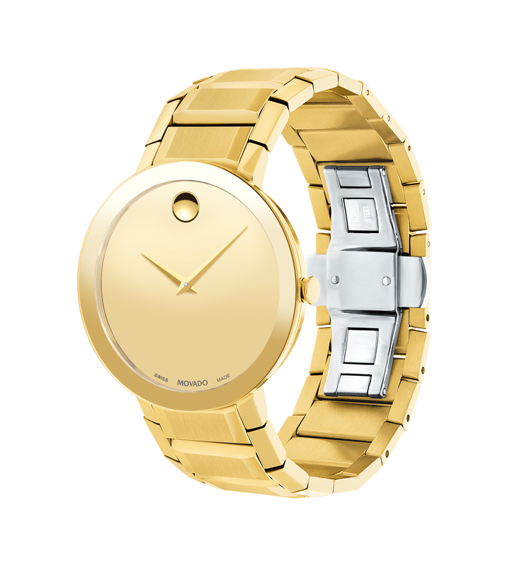 Movado Sapphire, 39 mm yellow gold PVD-finished stainless steel bezel-free case with flat edge-to-edge dark metalized sapphire crystal, gold-toned Museum dial and yellow gold PVD-finished stainless steel bracelet.