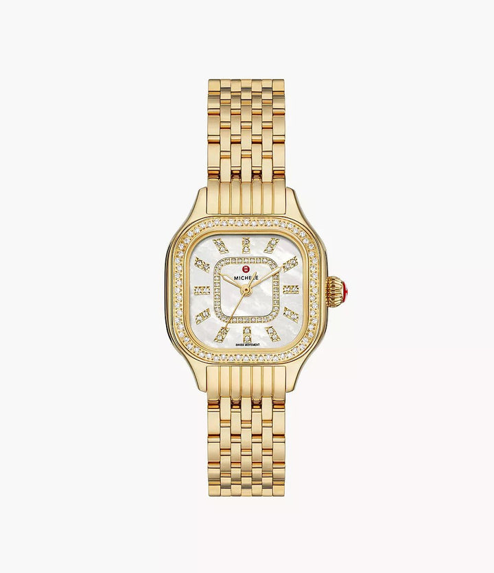 Elegant curves add modern elegance to the case of MICHELE's stunning Meggie watch that sparkles with 64 hand-set diamonds on the top ring in our signature MW pattern and a mother-of-pearl dial with diamond inner ring and signature diamond indexes. This watch features a Swiss movement and a gleaming 14mm gold-tone stainless steel seven-link bracelet made specifically for the Meggie collection interchangeable with any 14mm MICHELE strap.