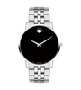 Men's Movado Museum Classic watch, 40 mm stainless steel case, black Museum dial with silver-toned dot and hands, stainless steel link bracelet with deployment clasp.