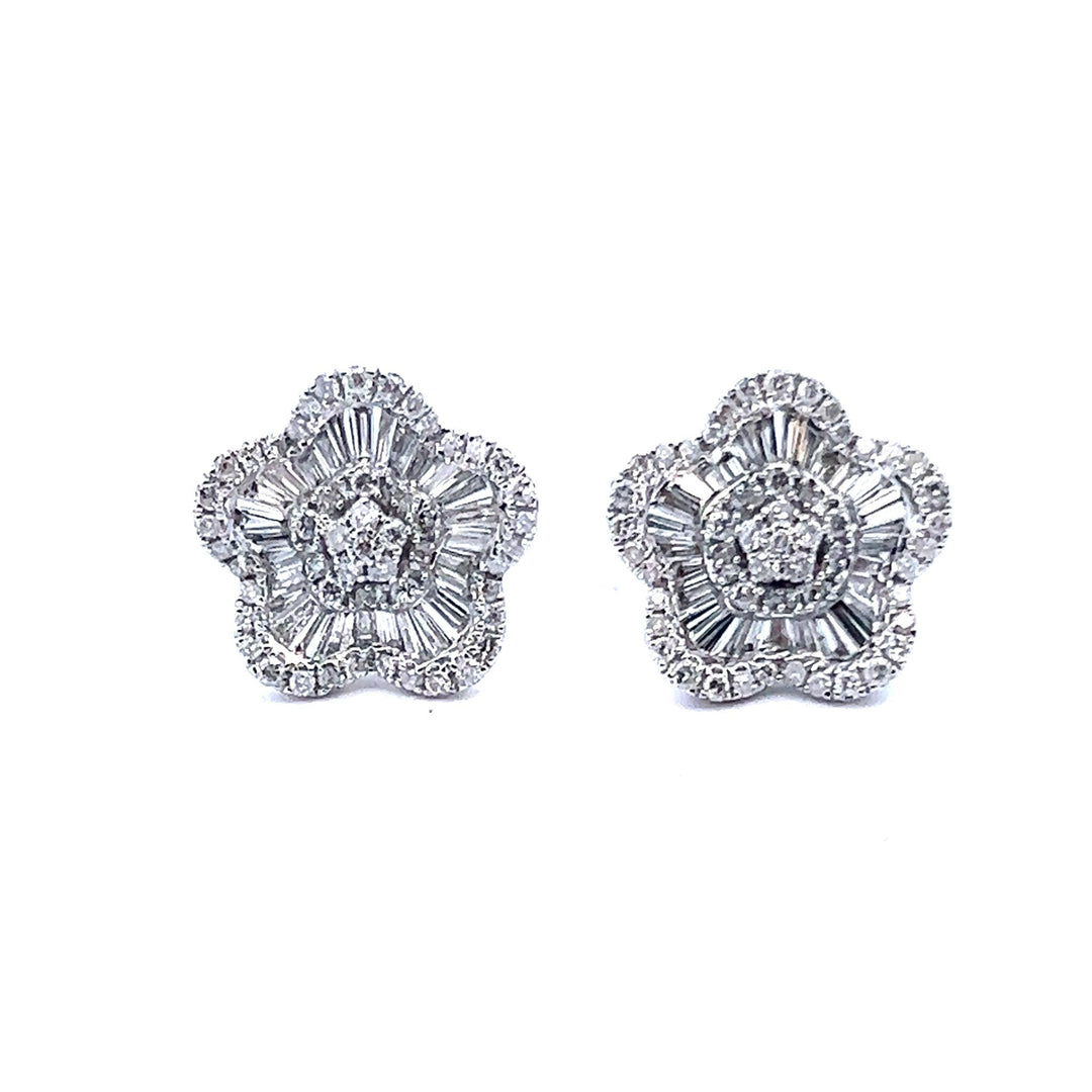 14k white gold earrings in flower design with baguette cut diamonds on pedals and round cut diamonds throughout (TCW .196). Features post and back.