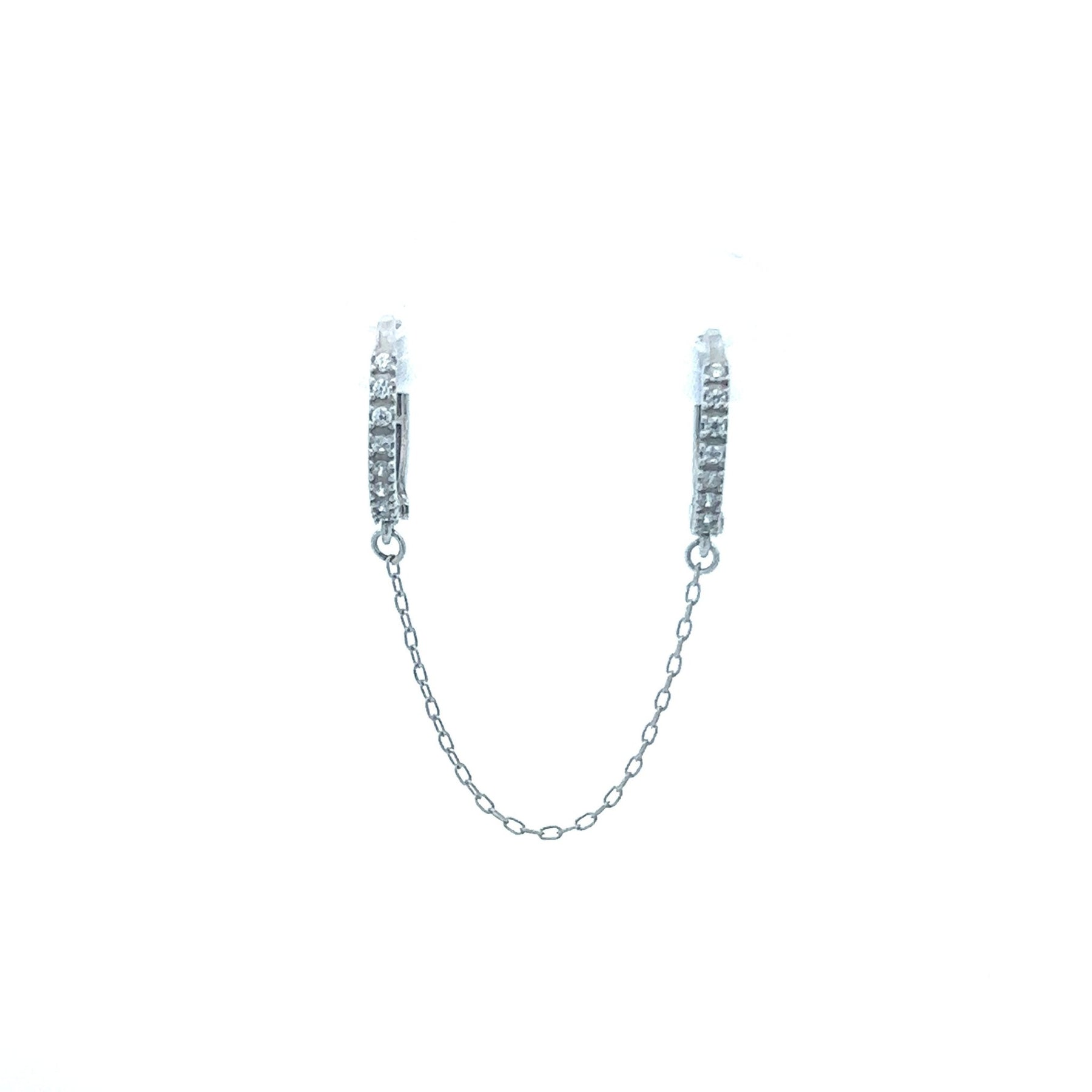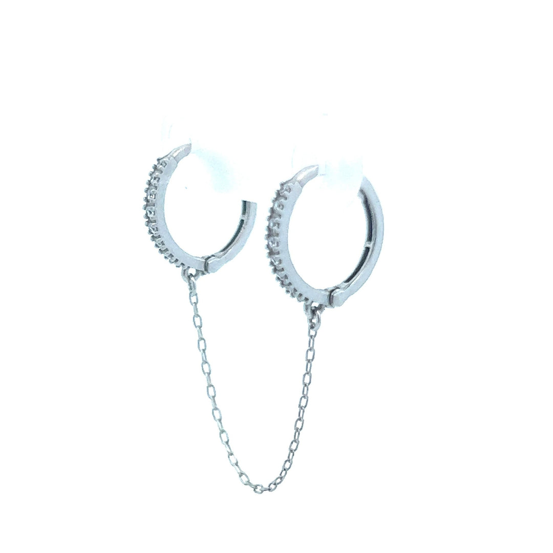 This exquisite piece combines the timeless elegance of hoops with a modern twist. Crafted from luxurious white gold, it features a delicate chain connecting both hoops, adding a unique and stylish element to the design. The hoops are adorned with sparkling cubic zirconia detailing, adding a touch of brilliance and sophistication. Behind each hoop, you'll find sturdy stick posts, ensuring a secure and comfortable fit. Elevate your style with this captivating earring, perfect for adding a touch of glamour to any outfit.