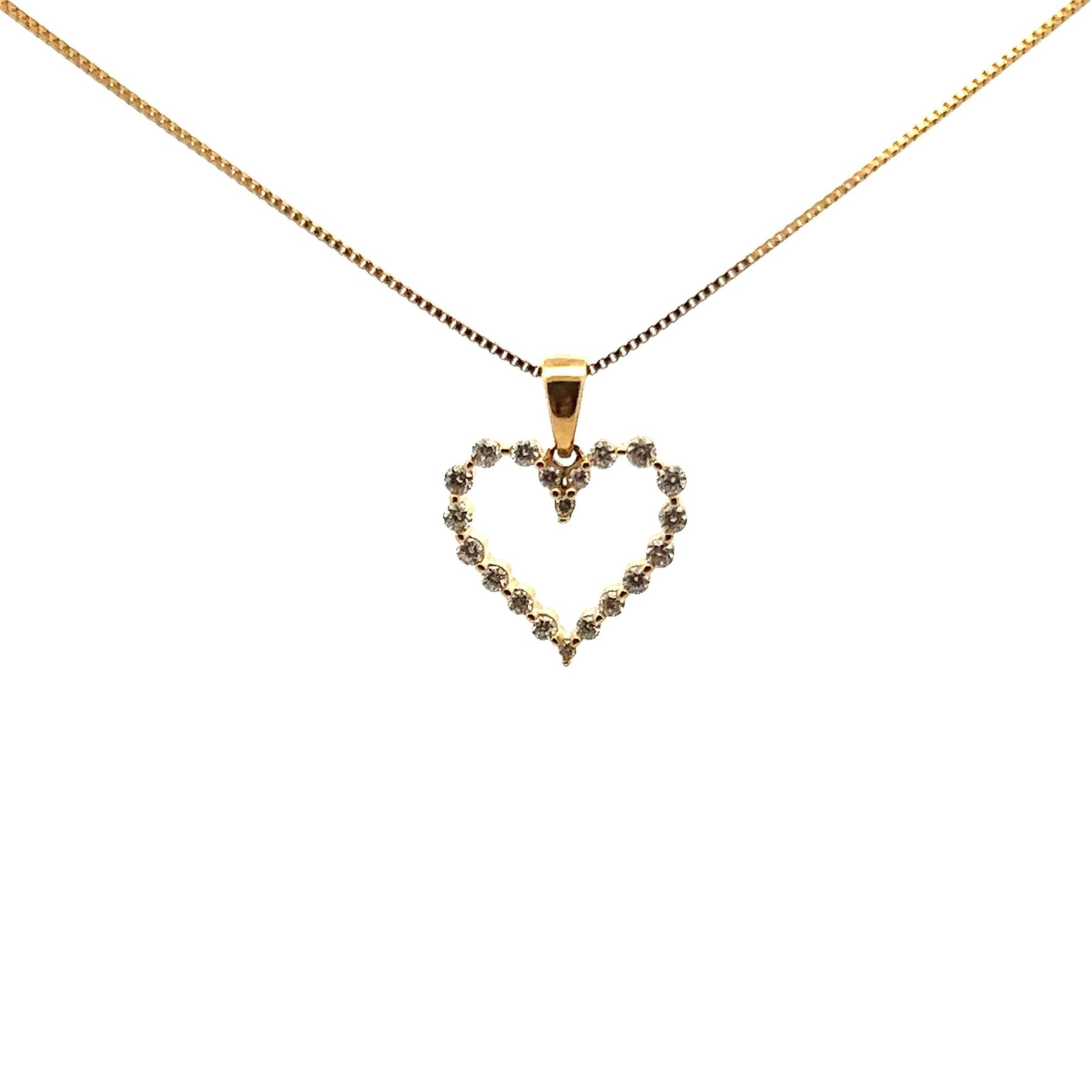 14K yellow gold pendant necklace with open heart design, lab grown round cut diamonds and yellow gold chain.