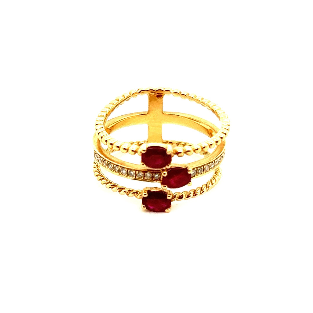 18K yellow gold ring with triple design, red ruby and diamond detailing (TCW .10)