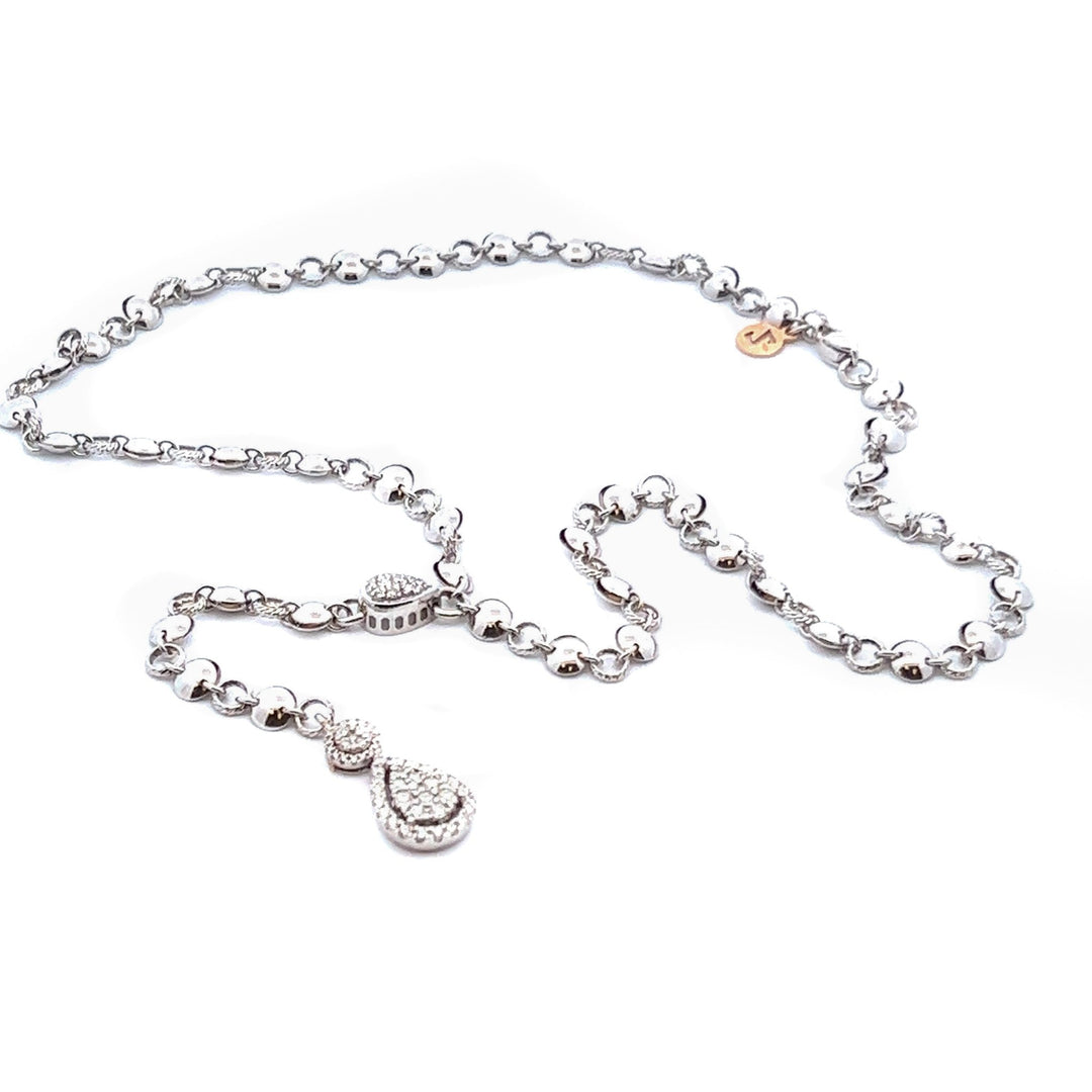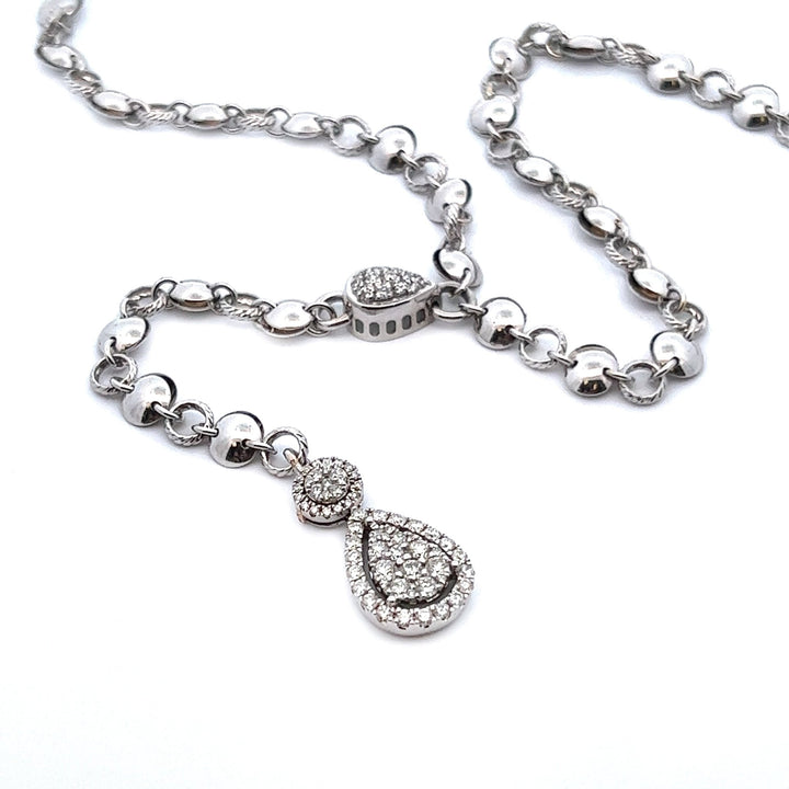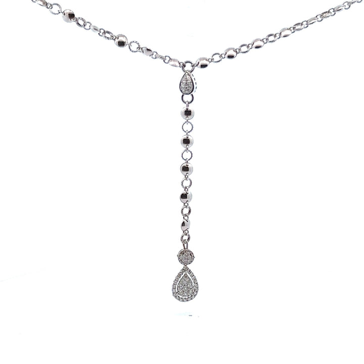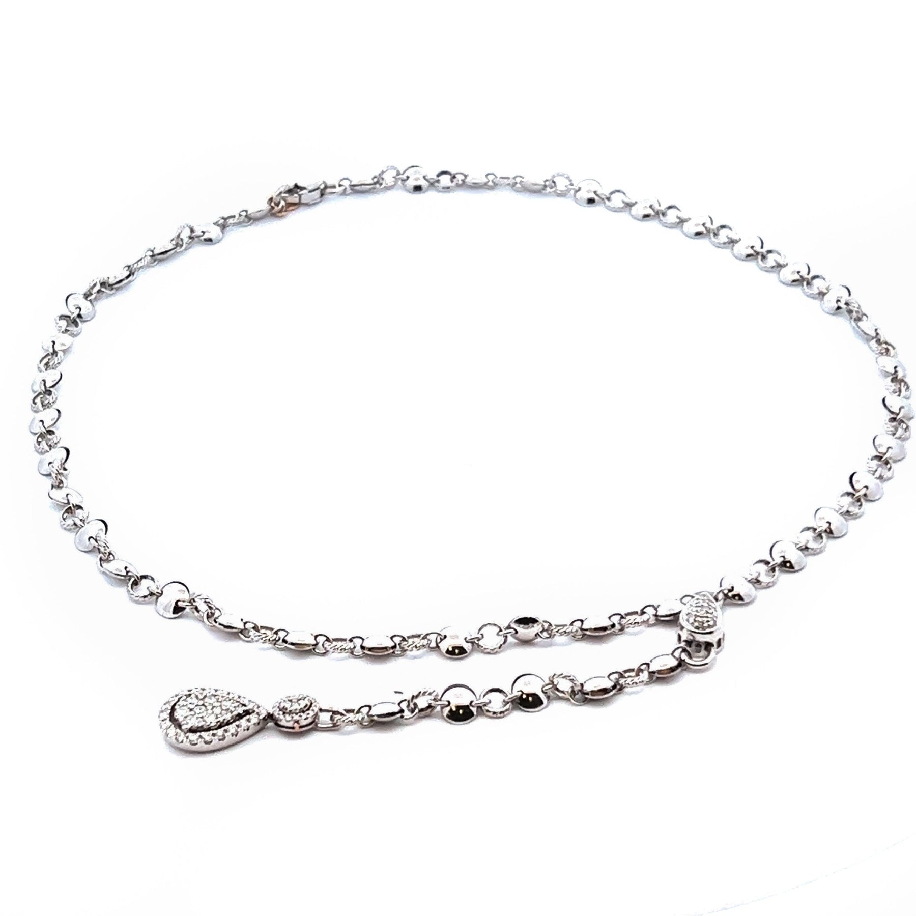18K white gold lariat style necklace (17") with diamond set pendant (2.00ct). Features lobster clasp closure in back.