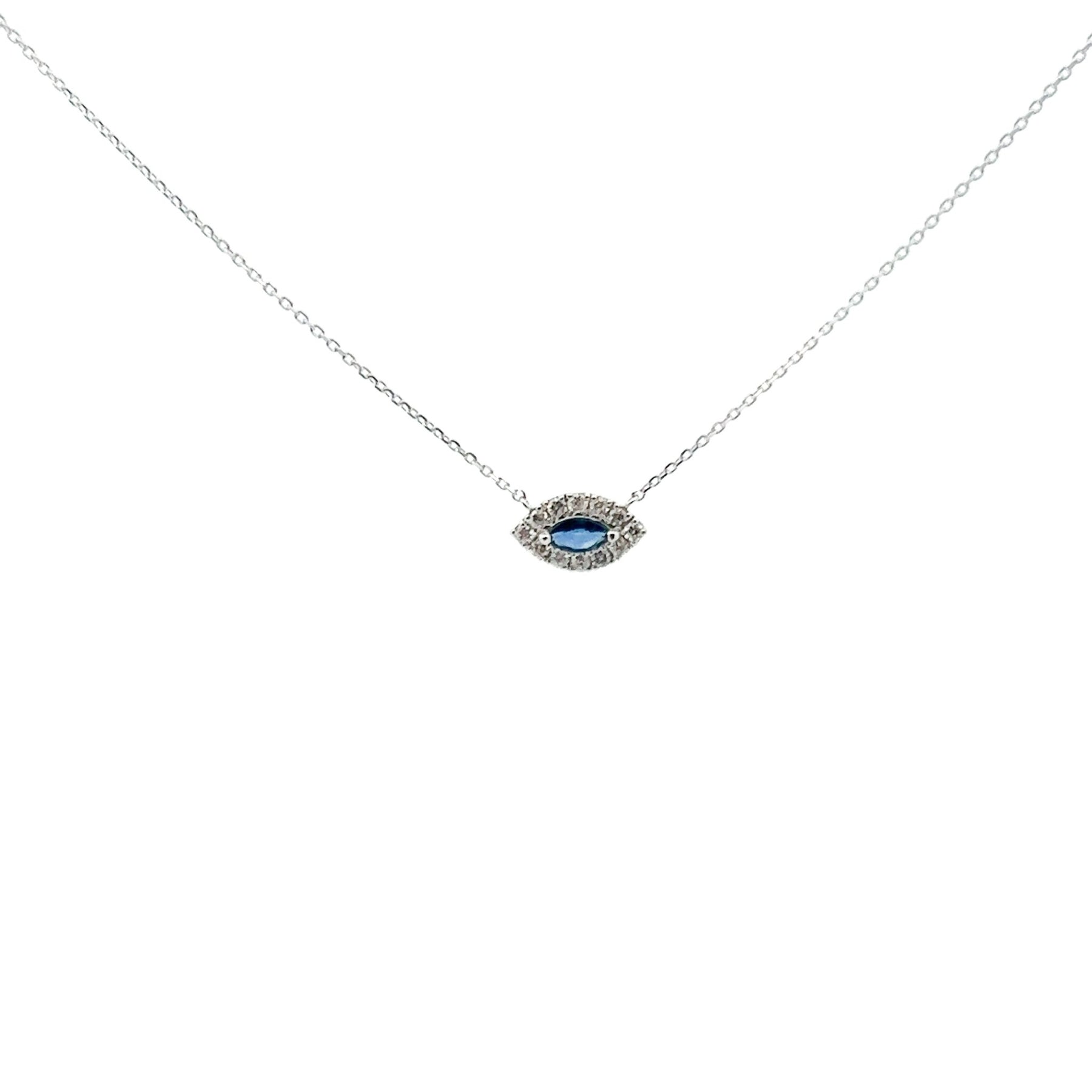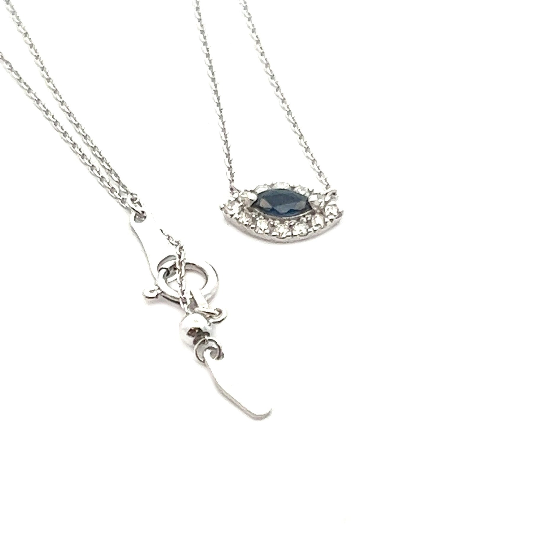 18K white gold necklace with "Evil Eye" pendant design featuring blue sapphire in center and small set diamonds.