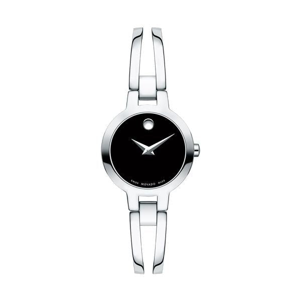 The Women's Amorosa Watch is a stunning timepiece with a 24mm stainless steel case and black Museum dial with silver-toned dot and hands. The stainless steel double-bar bangle-style bracelet is adjustable with back sizing links and a jewelry clasp for a perfect fit. Water-resistant and comes in a stylish box.
