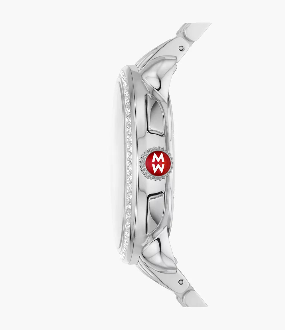 This Serein stainless diamond watch timepiece features chronograph movement, 123 brilliant hand-set diamonds (0.62 carat weight) along the bezel and white mother-of-pearl dial. Paired with a seven-link stainless bracelet, this 18mm bracelet is made specifically for the Serein and is interchangeable with any 18mm MICHELE strap.