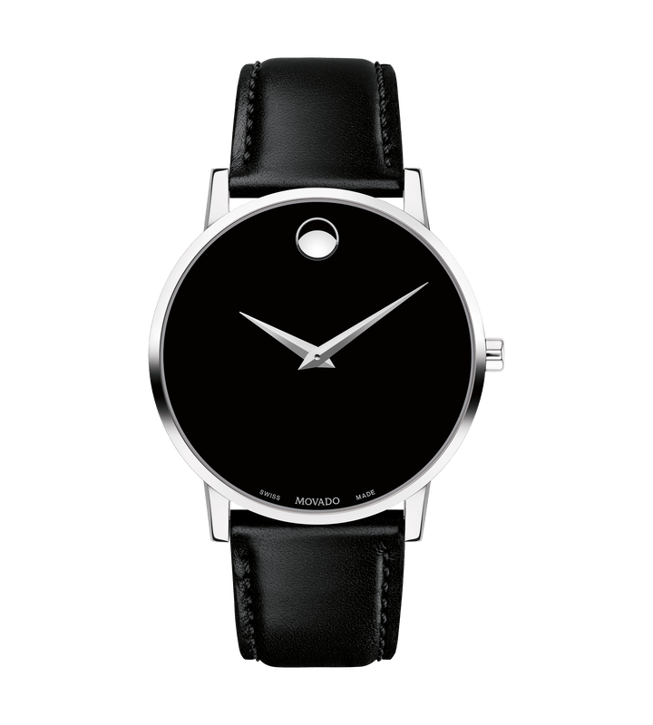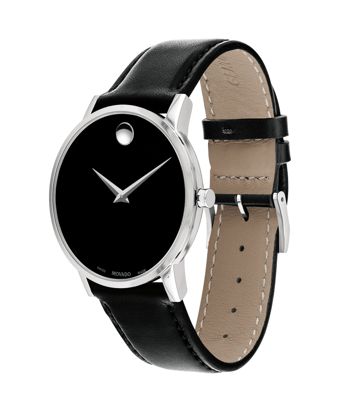 Men's Museum Classic watch, 40 mm stainless steel case, black Museum dial with silver-toned dot and hands, smooth black calfskin strap with stainless steel buckle.