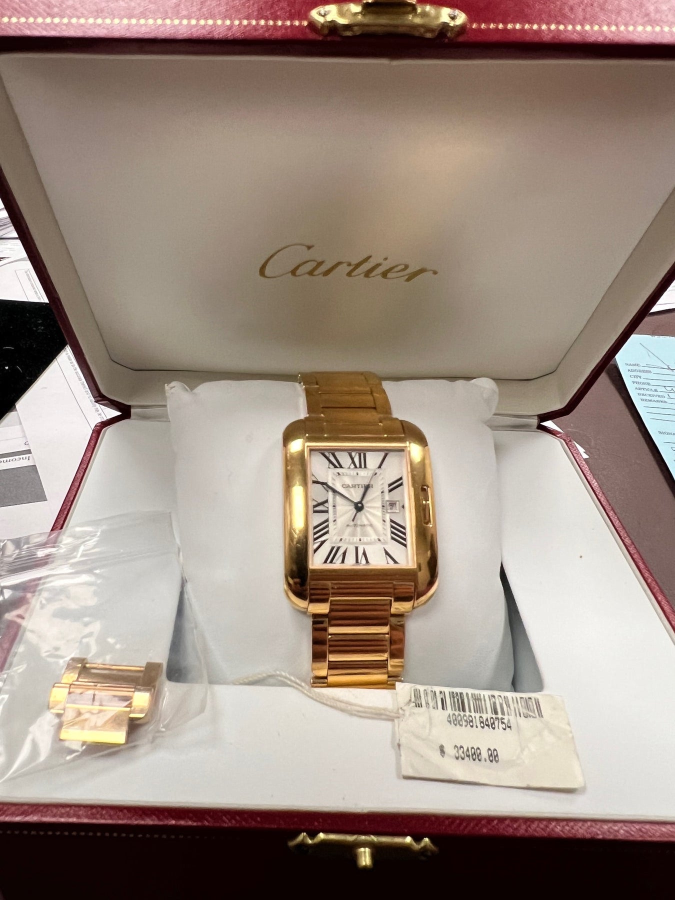 We are offering an opportunity to own at a fraction of the original price ($33,400.00) a little worn Cartier Full Size (30mm) Rose Gold 18 Karat Tank Anglaise. The watch comes with original Box and Booklet, Tag