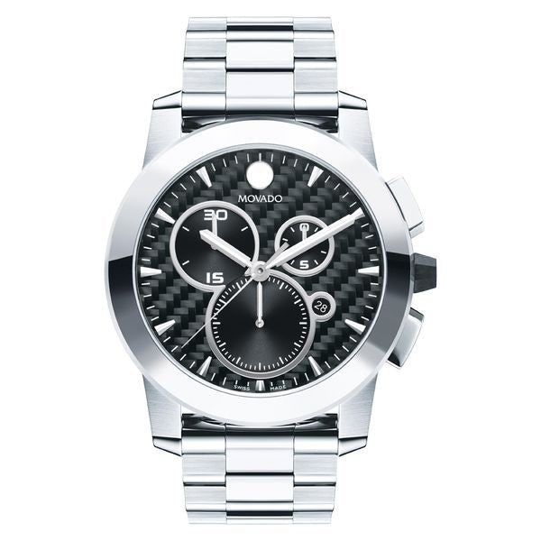 Movado Vizio Chronograph, 45 mm stainless steel case with Dura904 steel bezel and black carbon fiber chronograph dial. Features a screw down crown, Swiss Super-LumiNova® accents, engraved caseback, and stainless steel bracelet.